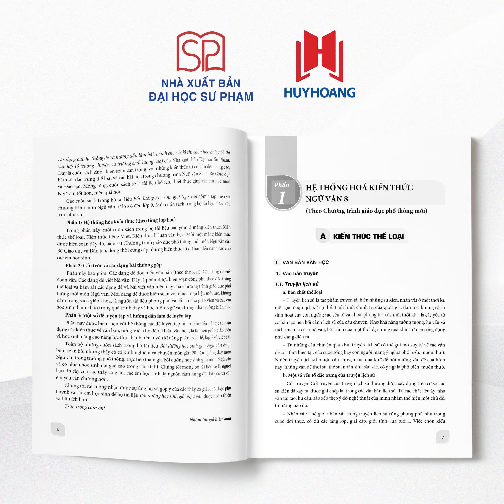 "Với mong muốn trở thành người bạn đồng hành đáng tin cậy của giáo viên và học sinh trong hành trình chinh phục và nuôi dưỡng niềm đam mê với văn chương, cuốn sách Bồi dưỡng học sinh giỏi Ngữ văn 8 được biên soạn dựa trên những định hướng của Chương trình giáo dục phổ thông mới môn Ngữ văn, đồng thời bám sát các đặc trưng của môn Ngữ văn. Các tác giả đã xây dựng các phần, các mảng kiến thức và các đề luyện tập từ cơ bản đến nâng cao, giúp các em học sinh vừa có thể đáp ứng được chương trình học trên lớp, vừa phát triển những năng lực đặc thù của môn học này và có những kiến thức, kĩ năng tốt đáp ứng các kì thi học sinh giỏi các cấp. Cuốn sách được cấu trúc như sau: - Phần 1: Hệ thống hóa kiến thức Nội dung bao gồm 3 mảng kiến thức: Kiến thức thể loại, Kiến thức tiếng Việt, Kiến thức lí luận văn học. Mỗi một mảng kiến thức được biên soạn đầy đủ, bám sát Chương trình giáo dục phổ thông 2018 môn Ngữ văn của Bộ Giáo dục và Đào tạo, đồng thời cung cấp những kiến thức từ cơ bản đến nâng cao cho các em học sinh. - Phần 2: Cấu trúc và các dạng bài thường gặp Phần này bao gồm: Các dạng đề đọc hiểu văn bản (theo thể loại), Các dạng đề viết đoạn văn, Các dạng đề viết bài văn. Đây là phần được biên soạn công phu theo đặc trưng thể loại và bám sát các dạng đề và bài viết văn hiện nay của Chương trình giáo dục phổ thông mới môn Ngữ văn. Mỗi dạng đề được biên soạn với nhiều ngữ liệu mới mẻ, không nằm trong sách giáo khoa, là nguồn tài liệu phong phú và bổ ích cho giáo viên và các em học sinh tham khảo. - Phần 3: Một số đề luyện tập và hướng dẫn làm đề luyện tập Phần này được biên soạn với hệ thống các đề luyện tập, vận dụng các kiến thức về văn bản, tiếng Việt cho đến lí luận văn học; là tài liệu giúp giáo viên và học sinh nâng cao năng lực thực hành, rèn luyện kĩ năng phân tích đề, lập ý, viết bài. "